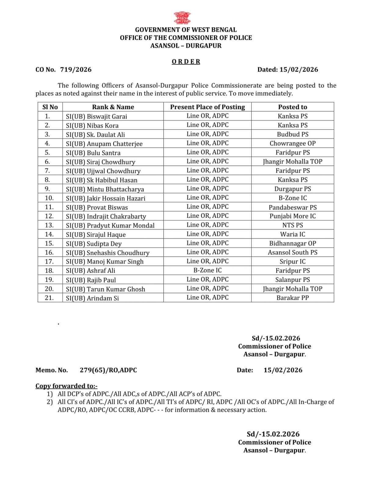 आसनसोल/दुर्गापुर: Asansol–Durgapur Police Commissionerate की ओर से जारी आदेश (CO No. 719/2026, दिनांक 15/02/2026) के तहत पुलिस विभाग में व्यापक प्रशासनिक फेरबदल किया गया है। …