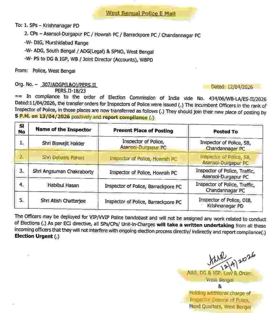 কলকাতা: নির্বাচনকে ঘিরে প্রশাসনিক তৎপরতা তুঙ্গে। এই পরিস্থিতিতে পশ্চিমবঙ্গ পুলিশ ই-মেলের মাধ্যমে এক গুরুত্বপূর্ণ নির্দেশ জারি করে রাজ্যজুড়ে ইন্সপেক্টর পদে কর্মরত একাধিক আধিকারিকের বদলি ঘোষণা …